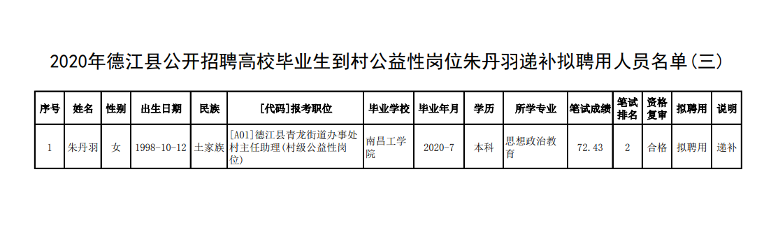公示名單:《2020年德江縣公開招聘高校畢業(yè)生到村公益性崗位遞補擬聘用人員名單》