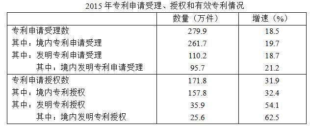 2015年,全國研究與試驗發(fā)展經(jīng)費支出14220億元,與國內(nèi)生產(chǎn)總值之比為2.1:100,其中基礎(chǔ)研究經(jīng)費671億元。截至年底,全國共擁有有效專利547.8萬件,其中境內(nèi)有效發(fā)明專利87.2萬件,每萬人口境內(nèi)有效發(fā)明專利擁有量6.3件。