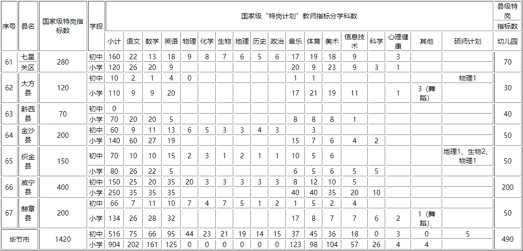 2. 大方縣2019年農(nóng)村義務(wù)階段學校教師特設(shè)崗位計劃表