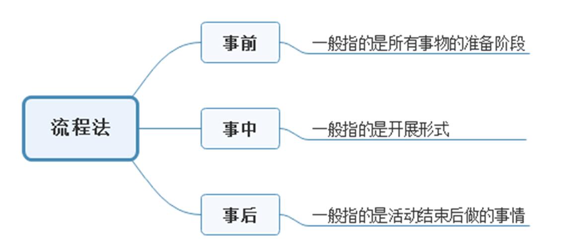 流程答題法:是以時(shí)間為標(biāo)準(zhǔn),將一個(gè)活動組織過程分為事前、事中、事后三個(gè)階段,每個(gè)階段又可以根據(jù)活動本身的特點(diǎn)分為若干個(gè)環(huán)節(jié)。