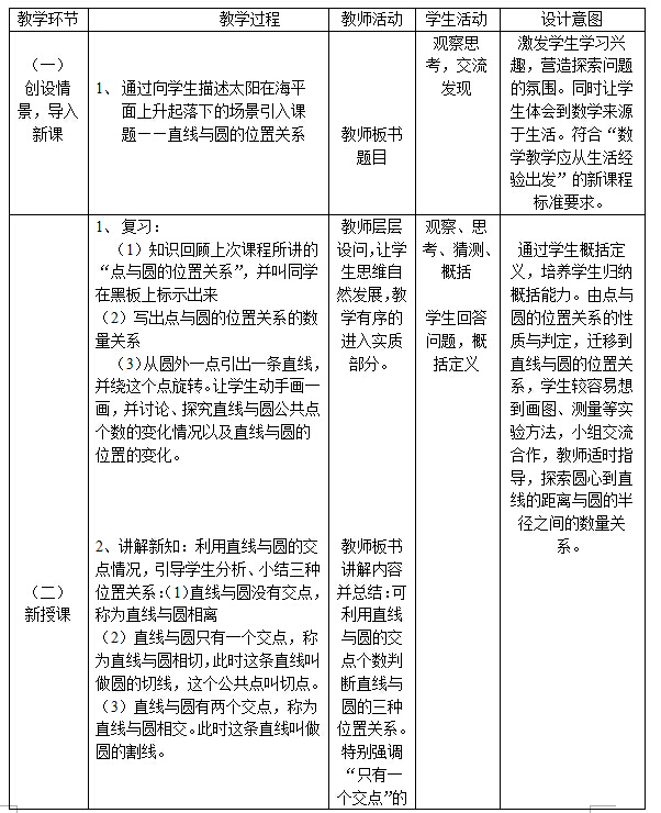 2.過程與方法:通過觀察、實驗、討論、合作研究等數(shù)學活動使學生了解探索問題的一般方法;由觀察得到“圓心與直線的距離和圓半徑大小的數(shù)量關(guān)系對應等價于直線和圓的位置關(guān)系”從而實現(xiàn)位置關(guān)系與數(shù)量關(guān)系的轉(zhuǎn)化,滲透運動與轉(zhuǎn)化的數(shù)學思想。
