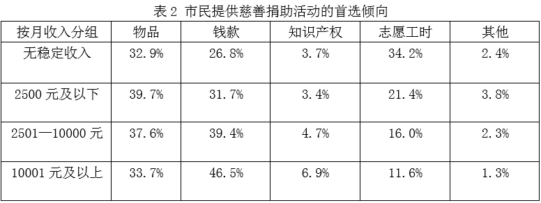 C. 愿意參加慈善捐助的人中,月均收入超過1萬元的人選擇錢物捐助的比例比有穩(wěn)定收入但月均收入2500元及以下的人高10個百分點以上