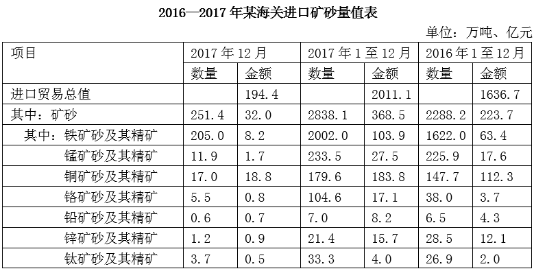 99. 2017年全年,該海關總計進口鐵、錳、鉻、鉛、鋅、鈦之外的礦砂及其精礦約多少億元?